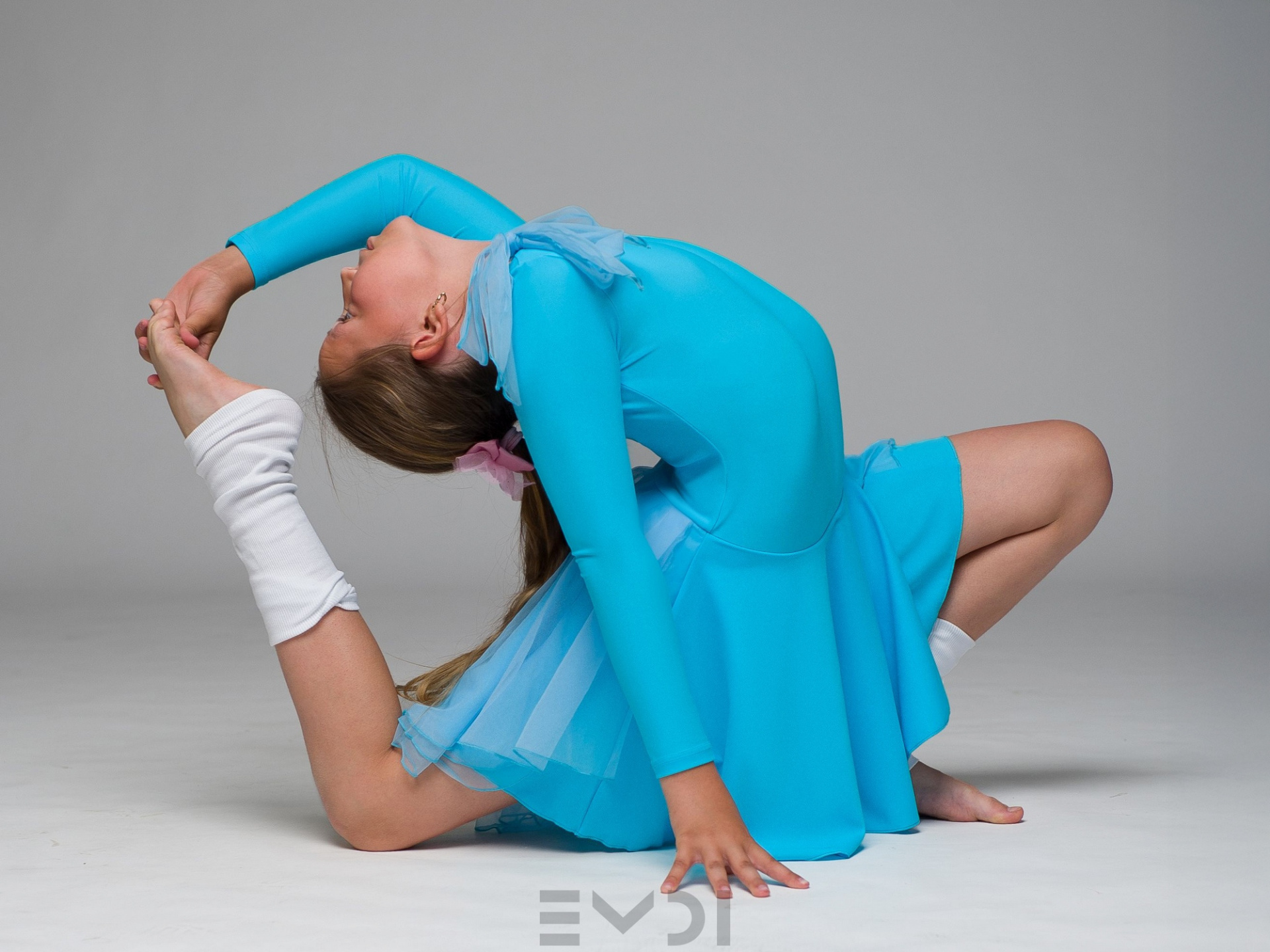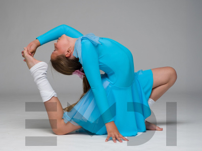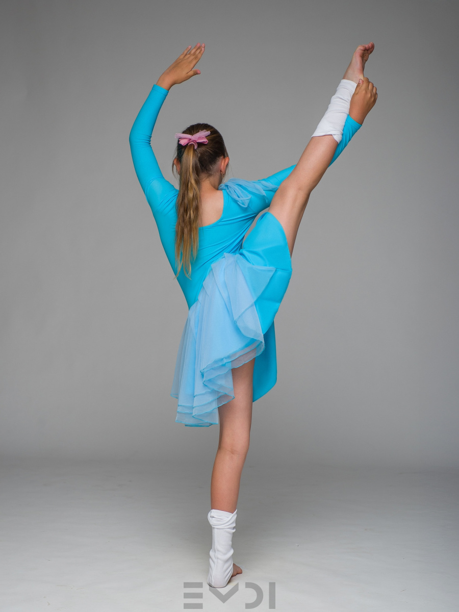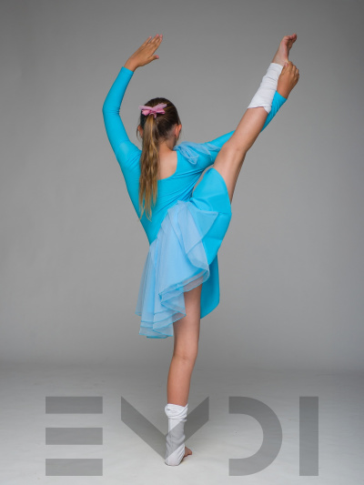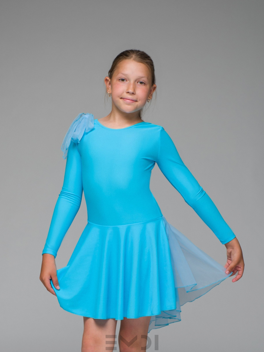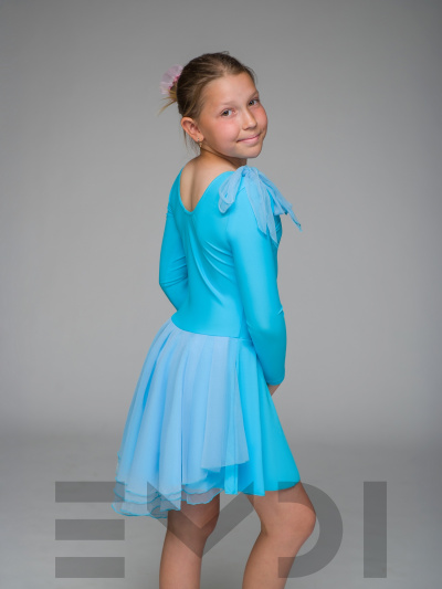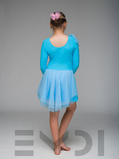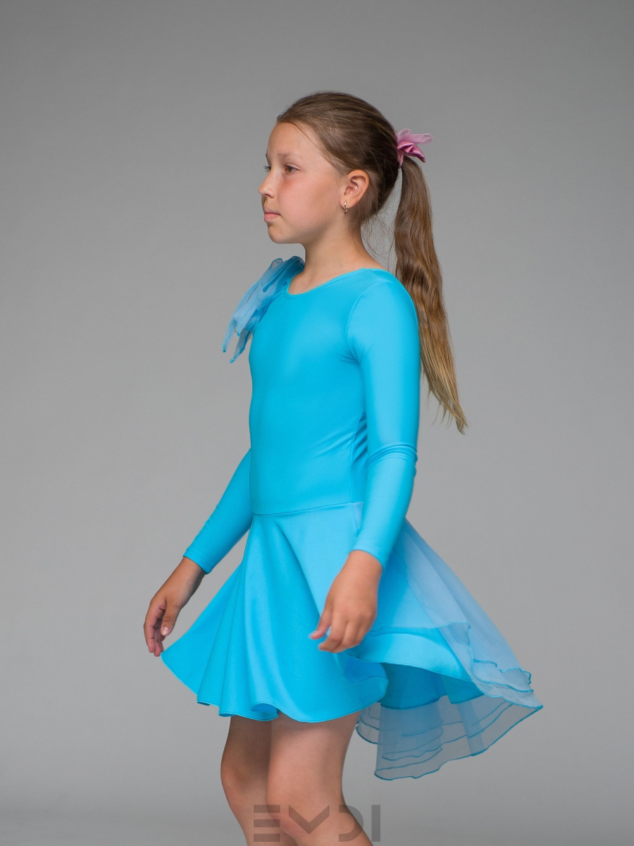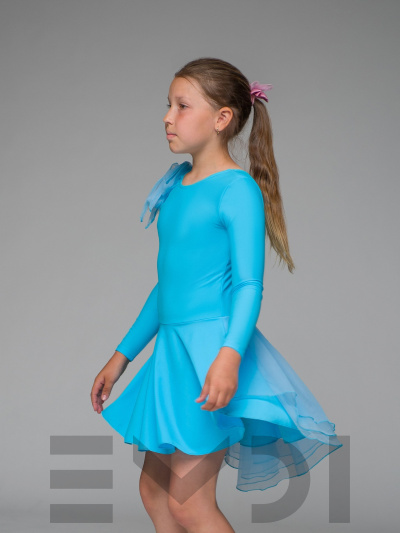 Комбидресс для занятий бальными танцами и хореографией. Вшитая юбка на спине собрана в широкую складку, драпированная органзой и стильно удлинена. Декоративный бант на плече несъемный.
