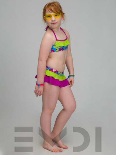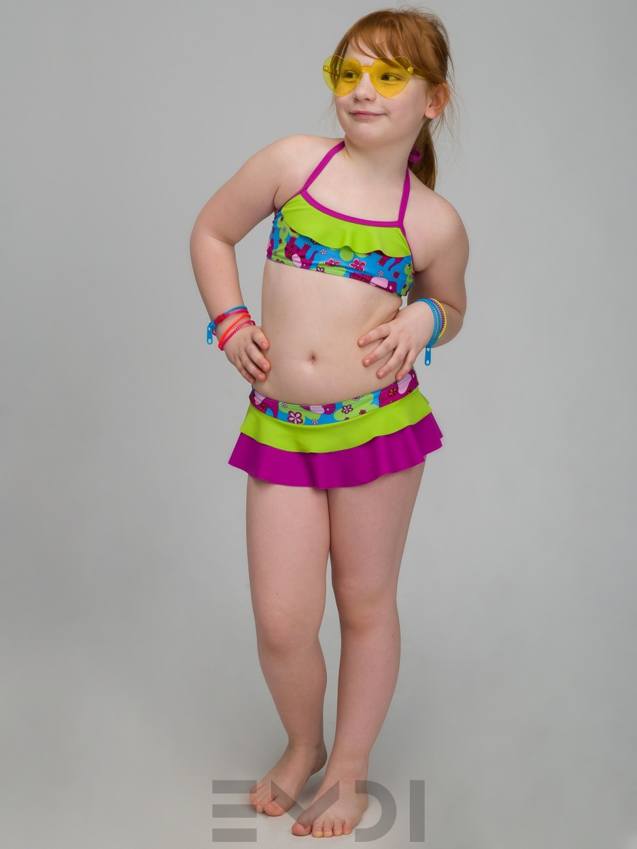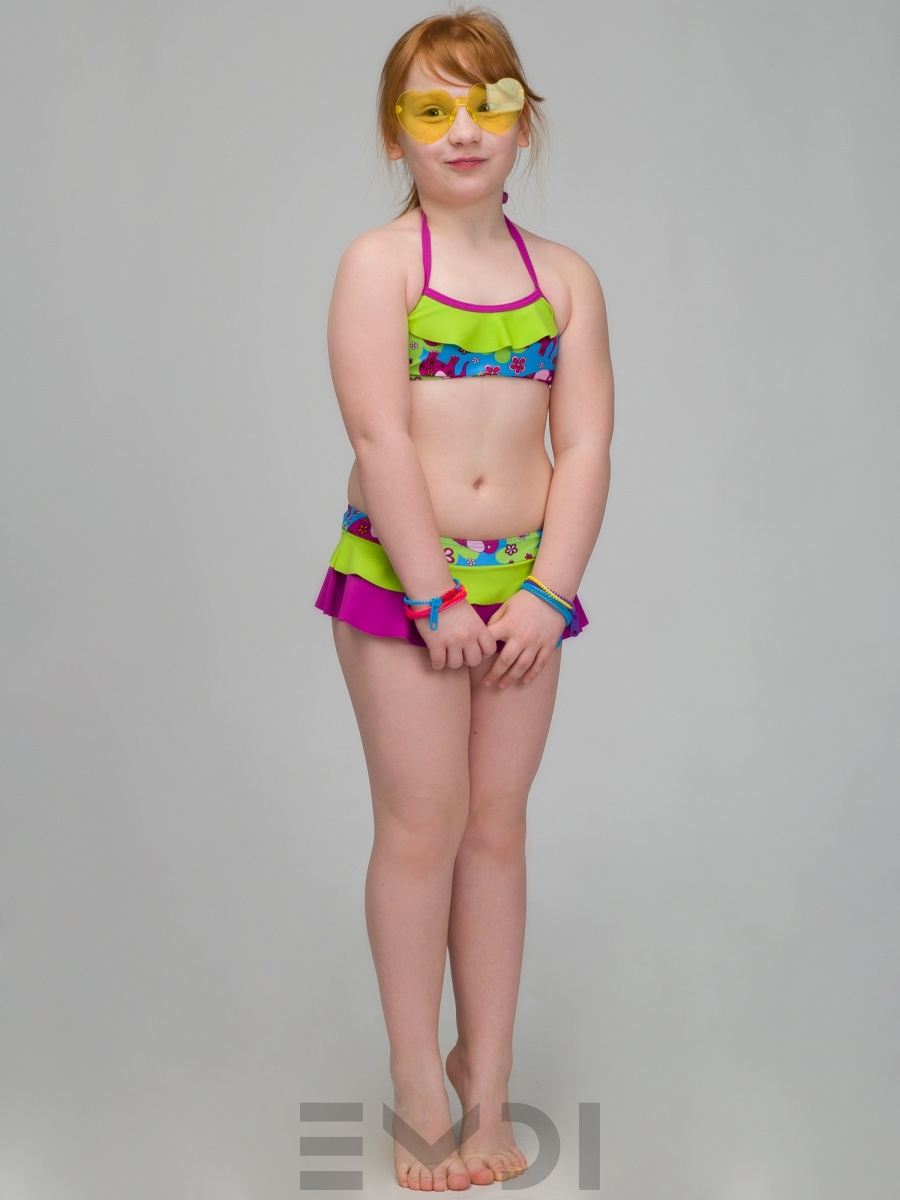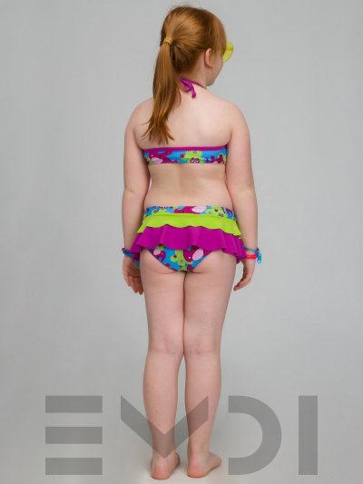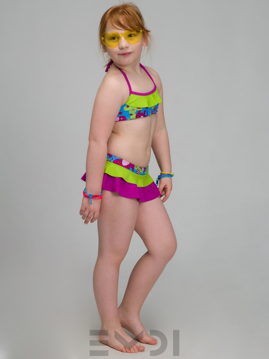 Оригинальный пляжный купальник для маленькой модницы. Выполнен из яркого принта и украшен контрастными рюшами.