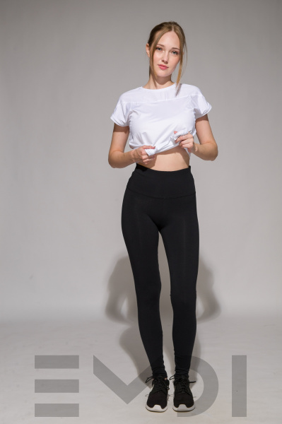Женские лосины очень удобного и простого покроя. Широкий пояс позволит с удовольствием носить их на любые тренировки.