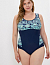 Модный купальник с яркими принтованными вставками.Дублированный лиф.застёжка на спине.Материал устойчив к хлорированной и морской воде.