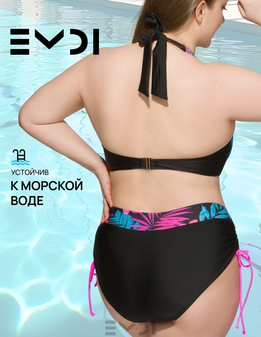 Яркий раздельный купальник в стиле Пландж. Лиф имеет вшитые поролоновые чашки усиленный корсаж под грудью и боковые кости для дополнительной поддержки. Перед плавок дублируется. Пояс усилен прошитой латексной резиной. Плавки драпируются по бокам, что позволяет регулировать их высоту. Материал устойчив к морской воде.