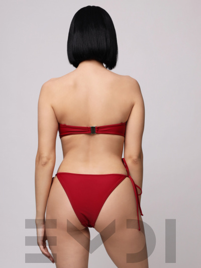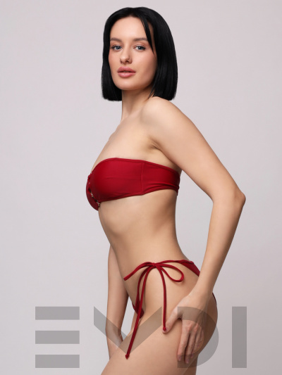 Роскошный купальник-бандо с эффектной фурнитурой по центру лифа. В комплекте идут регулируемые съемные бретели. Трусики- бикини с боковыми завязками.