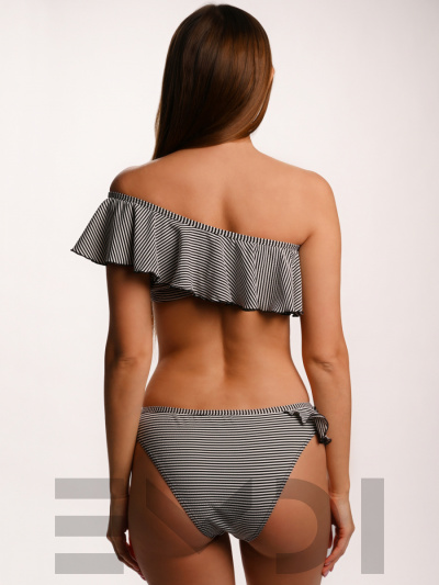 Ультрамодный летний купальник - бандо с лифом на одно плечо. По вырезу горловины пришит широкий волан. Лиф может стать самостоятельной частью вашего летнего гардероба. Плавки с низкой посадкой. Дублированный перед. Самый актуальный трикотаж этого сезона устойчив к морской воде и солнечному свету.