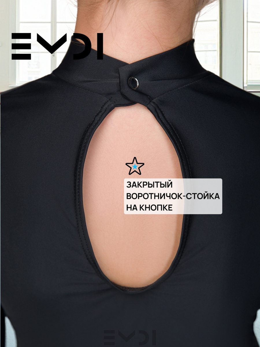 Классический гимнастический комбидресс с закрытым воротничком-стойка. Длина рукава соответствуют требованиям гимнастических школ.